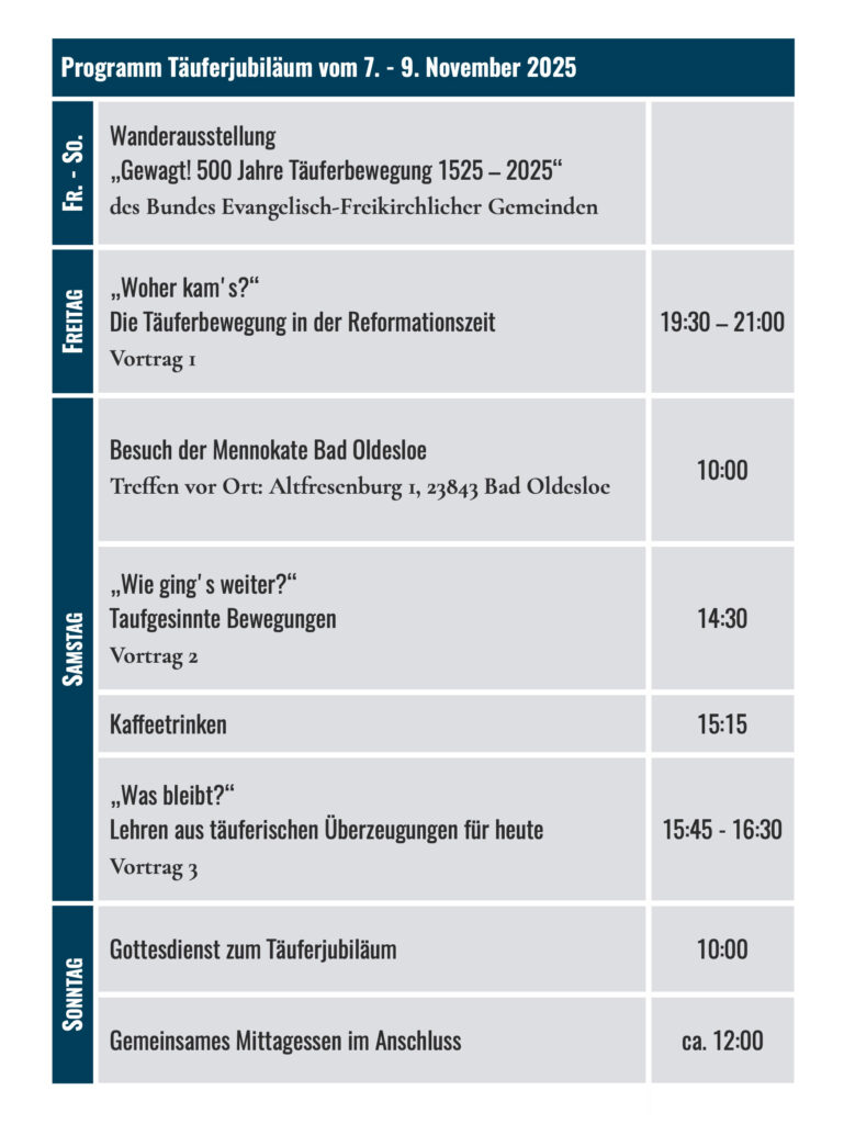 In der Zeit von 7. – 9. November 2025 ist ebenfalls die Wanderausstellung „Gewagt! 500 Jahre Täuferbewegung 1525 – 2025“ des Bundes Evangelisch-Freikirchlicher Gemeinden in unseren Räumlichkeiten zu besichtigen.